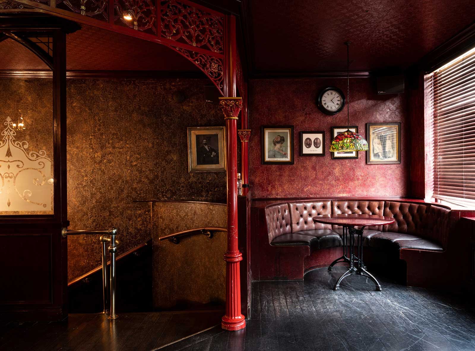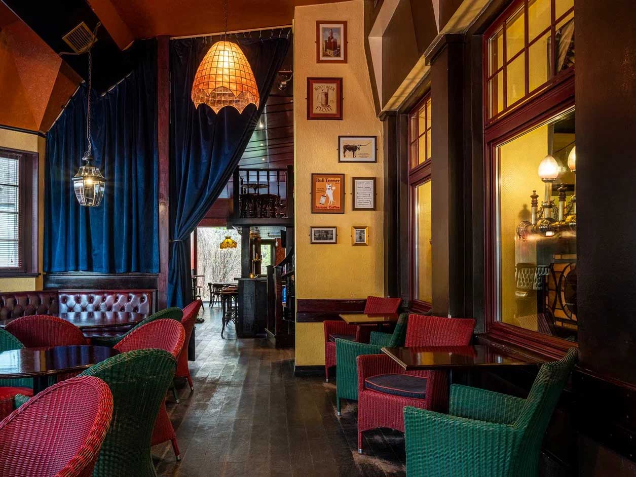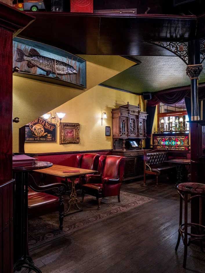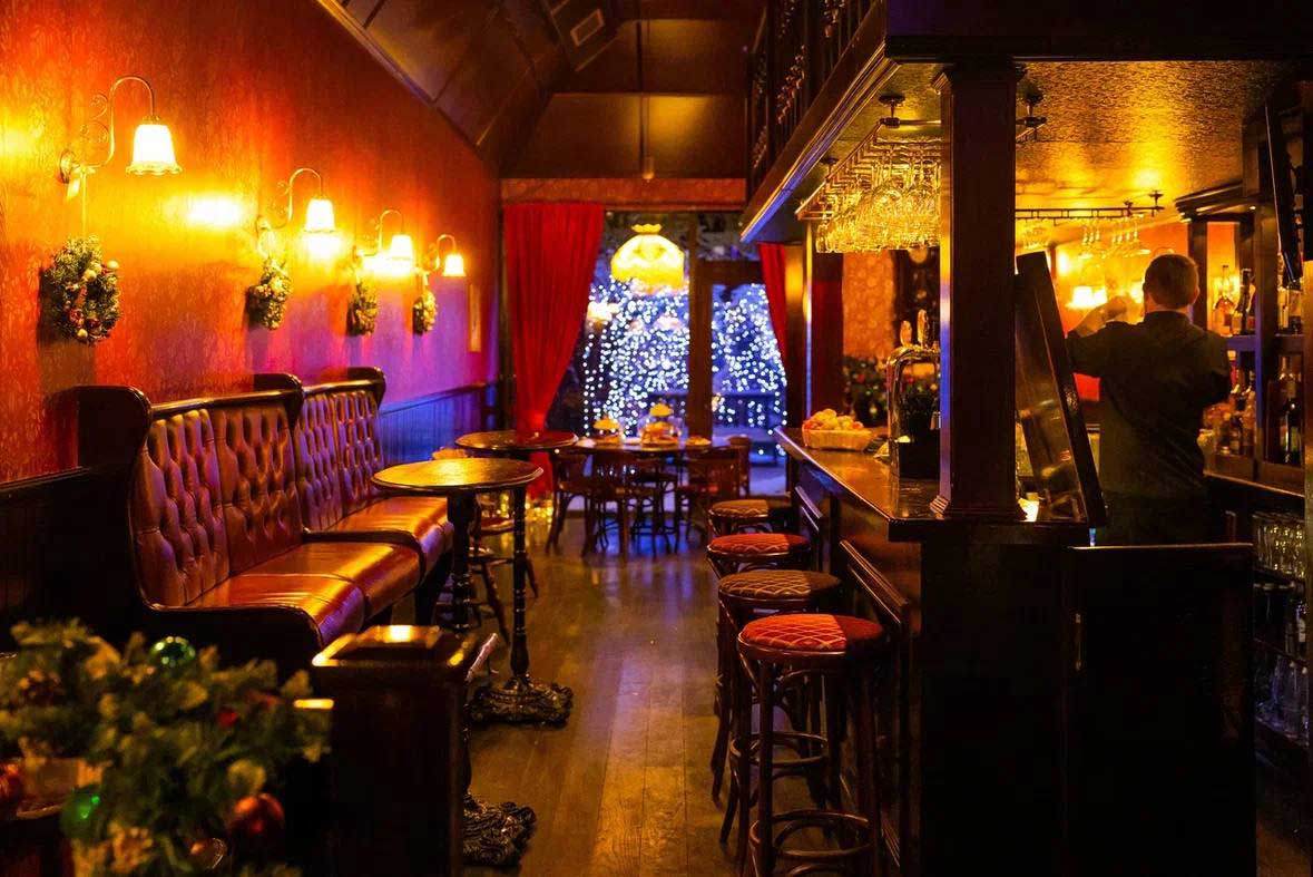 · «Алый зал» — самое популярное пространство «Тонн» на первом этаже. Узнаваемый ало-золотой интерьер, старинный камин, балкон с балюстрадой и выход в маленький дворик для тех, кто мечтает загадать желание, глядя в зимнее небо.